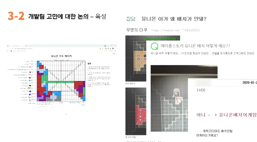 김창섭: 저도 우선 처음에 그거를 설계했을 때 의도는 각 직업군별로 성장하는 캐릭터 블록이 있고 그 캐릭터 블록을 적절하게 배치를 해서 나에게 필요한 능력치를 획득하는 경험 자체가 즐거운 경험이 되고 도전적인 경험이 되기를 기대를 했었습니다. 하지만 말씀해주셨던 것처럼 해당 내용이 모든 고객님들에게 꼭 즐겁고 도전적인 경험만은 아니었던 같습니다. 그래서 지금 화면에서 보여주고 계시는 저런 형태의 별도의 프로그램을 이용을 해서 지원을 받고 있는 것으로 파악을 하고 있는데요. 저런 것은 어떻게 보면 편의성 영역의 측면이라고 볼 수 있을 것 같습니다. 그래서 해당 영역에 대해서 조금 더 친절하게 고객님들에게 안내해 줄 수 있는 방법이 인게임에서 구현할 수 있을지는 고민을 해서 빠른 시일 내에 말씀드리도록 하겠습니다.