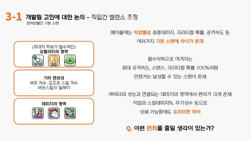 백호영: 먼저 유틸리티 영역의 최대치 확보가 필수적인 영역에서는 직업별 특성은 존재해야 할 것 같습니다. 예를 들면 궁수가 다른 직업들보다 크리티컬 확률이 높다든가 하는 그런 부분을 말씀드리고 있습니다. 그 부분은 발표자님께서도 말씀주셨듯이 캐릭터 특성으로서 어느 정도 존재하는 부분이나 공속이나 혹은 스탠스같은 부분은 평준화할 여지가 충분히 있다고 생각합니다. 이 부분은 특정 직업이 공속을 올리는 데 특별히 더 많은 노력을 더 들이지 않게 개선을 해야 할 것 같구요. 편의성 부분에서는 이 부분은 계속 해나가야 할 부분인 것 같습니다. 온오프 스킬 개수라든지 버프 개수같은 부분에는 버프를 패시브로 바꾸는 등의 작업을 저희가 계속 해오고 있구요. 이 부분은 계속 해나가도록 하겠습니다. 이번 4월 패치에서도 몇 개 직업이 예정되어 있구요. 이 부분은 4월 패치에서 확인하실 수 있을 것 같습니다. 데미지같은 경우는 저희도 고민이 굉장히 많은데요. 기본스탯뿐만이 아니라 스킬의 공격횟수, 또는 스킬의 공격속도 등에 의해서 편차가 좀 존재할 수 있는데요. 이 부분은 밸런스패치를 좀 더 자주 함으로 인해서 이 편차를 좀 더 빠르게 줄이도록 하겠습니다.