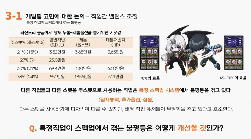 테러비터: 네 번째는 특수한 스탯을 사용하는 직업들이 느끼는 차별에 대한 문제입니다. 메이플스토리는 기본적으로 힘, 민첩, 지능, 행운의 4가지 스탯과 체력과 마나가 있습니다. 그러한 4가지 스탯이 아닌 HP나 올스탯을 사용하는 직업은 차별을 호소하곤 합니다. 왼쪽의 표를 보시면 제가 시간관계상 자세하게 설명은 못드리겠는데 일반적으로 한 아이템에서 잠재능력을 보유하고 추옵으로 재설정할 때 일반적으로 레전드리 등급에서 21%를 뽑을때는 모든 직업이 동등하지만 30%, 33%에 있어서는 제논은 다른직업의 2배 가까운 돈, 그리고 33%에서 제논은 다른 직업의 2배 이상의 돈을 쓰는 현상이 나타나고 있습니다. 물론 데몬어벤저는 30% 그리고 33%에 있어서는 일반적인 직업보다 조금 더 낮은 비용의 잠재능력을 뽑을 수 있지만 대신 27%라는 옵션이 아예 없기 때문에 어느정도 불평등을 느끼고 있습니다. 그리고 2번재는 아케인심볼과 어센틱심볼에 관한 내용입니다. 두 직업은 다른 직업들보다 늦은 효율을 보이고 있습니다. 데몬어벤저는 심볼레벨 1당 체력이 1750이 오르고 제논은 심볼레벨 1당 힘, 덱스, 럭이 39씩 오릅니다. 아케인심볼 출시 당시에 운영진들이 계산을 해가지고 해당 수치를 부여하셨겠지만 유저들이 치밀하게 계산한 결과 데몬어벤저는 심볼에 있어서 타 직업의 70% 제논은 타직업의 60~70%의 효율만을 보이고 있습니다. 해당 부분에 있어서 많은 문의와 해당 직업의 아우성이 있었지만 운영진들은 묵묵부답하였습니다. 그래서 저희는 궁금합니다. 특정직업이 스펙에서 겪는 불평등은 어떻게 개선해주실 겁니까?