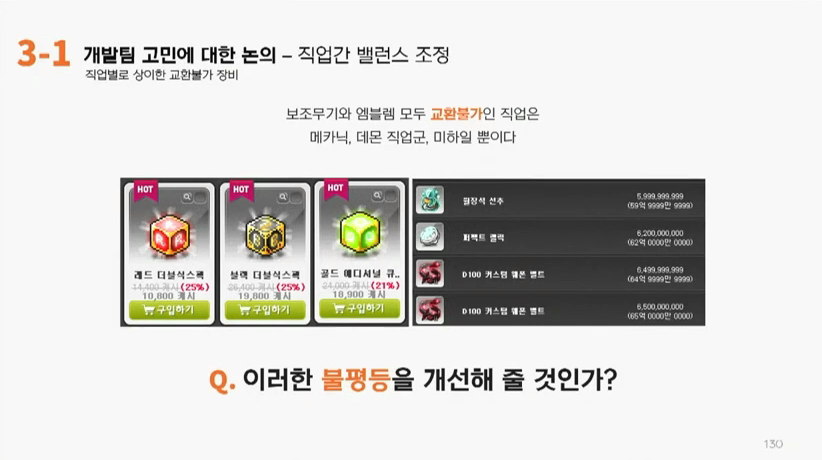 백호영: 이 부분은 저희도 고민이 많은 부분입니다. 스탯이 다른 스탯을 씀으로 인하여 장비 가격도 다르고 거기에 드는 잠재같은 것은 캐시 가격조차 다른 경우입니다. 이 부분을 어떻게 해결할까 저희도 고민이 많다 보니까 쉽게 수정을 못 하고 있습니다. 이 부분은 아까 이전에 발표드린 것처럼 테스트월드에 저희가 변경점을 추가한 뒤에 시간을 들여서 천천히 테스트하는 것이 더 좋다고 판단하고 있습니다. 밸런스패치 하면서 계속 고려해나가겠습니다.