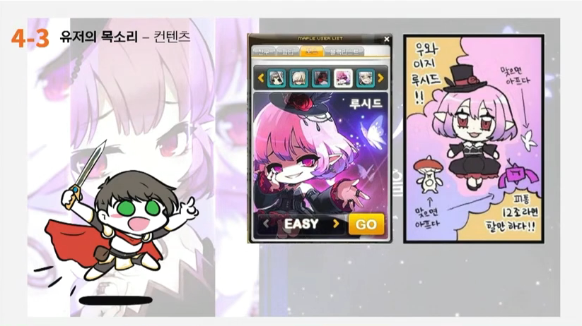 루델팡: 다음은요 일정구간에 유저분들이 즐길 수 있는 보스컨텐츠가 너무 적다는 내용입니다. 유저들이 아이템을 맞추면 맞출수록 더 강한 보스를 잡을 수 있다는 생각이 들어야 재미를 느낄 수가 있는데요. 하지만 지금 메이플은 하위보스랑 상위보스랑 간격이 너무 큽니다. 그러하여 결론은 진 힐라, 윌, 듄켈, 더스크 이지모드 출시해주세요 인데요. 이게 처음에 이지루시드가 처음 나왔을 때 오른쪽 그림처럼 유저분들은 굉장히 기뻐했던 것으로 기억을 합니다. 스펙과 상관없이 모든 유저가 상위 보스의 패턴을 파훼하는 재미만이라도 느꼈으면 좋겠구요. 이에 대해서 어떻게 생각하는지 궁금합니다.