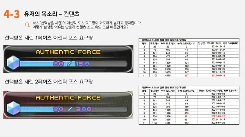 박세웅: 다음은 보스 세렌에 대한 질문인데요. 세렌의 1페이즈, 2페이지의 어센틱포스 요구량은 각각 150, 200입니다. 어센틱포스를 200을 찍기 위해선 세레니움 11레벨을, 아르크스는 9레벨을 달성해야하는데요. 일일퀘스트를 하루도 빠짐없이 다 할시 2022년 6월 22일에 200을 달성하게 됩니다. 이렇게 어센틱포스 요구량을 파멸적으로 설정한 것은 단순히 컨텐츠 속도 조절 때문인가요?