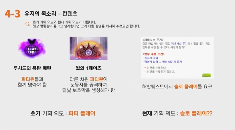박세웅: 일단 알겠습니다. 다음 질문인데요. 보스 루시드와 윌은 팀플레이를 상정하고 만들어진 보스입니다. 루시드의 폭탄 패턴은 파티원과 함께 맞아야 생존할 수 있고 윌 1페이즈의 주시하는 눈은 다른차원에 있는 파티원이 눈동자를 공격하여 반대 차원으로 달빛 보호막을 생성해야 생존할 수 있기 때문이죠. 그러나 해방퀘스트의 등장 이후 초기 기획의도와는 다르게 솔로플레이를 요구하고 있는데요. 초기 기획의도와 현재 기획의도가 다릅니다. 해당 방향성이 옳다고 생각하신다면 그에 대한 설명을 해주셨으면 좋겠습니다.