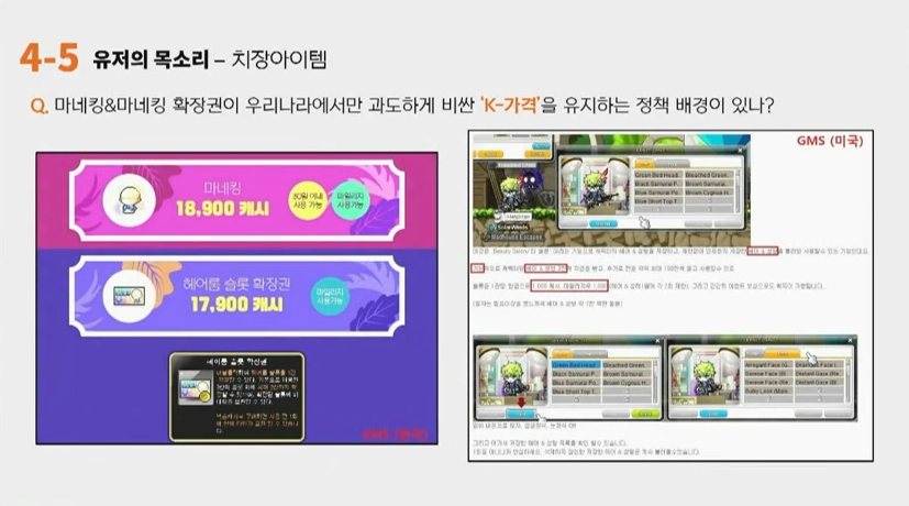 강원기: 이부분은 사실 저희가 오랫동안... 저희 2003년 9월부터 일본 서비스를 시작을 했었구요. 사실 되게 오랫동안 해외서비스를 하면서 저희는 철저한 현지화를 의도를 했습니다. 그러다보니까 지금 한 십 몇 년 지난 상황에서 보니까 IP만 동일하지 한국과 일본과 중국과 북미쪽에서의 메이플스토리는 아예 다른 게임이 되어 있습니다. 그러다보니까 특히 BM영역에서는 저희쪽보다 현지 퍼블리셔의 권한이 좀 더 큰 부분입니다. 사실 이것만 보게 되면 저희도 고객분들에게 변명의 여지가 없는 부분들 같아요. 거의 동일한 기능인데 한국만 비싸게 팔고 GMS에서는 싸게 팔고 있는데. 사실 이 예시와 반대 예시도 있긴 하지만 지금 여기서 언급하는 건 좀 부적절할 것 같구요. 뭐 확실하게 말씀드릴 건 고객분들이 이중과금이라고 부정적인 경험이라고 하셨기 때문에 이렇게는 안 할 예정입니다. 앞으로 헤어룸 성형룸 피부룸까지 해서 늘릴 때는 저희가 더 이상 추가슬롯에 대해서 늘리지 않고 기본슬롯을 늘리는 형태만 진행을 하도록 하겠습니다.