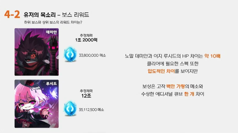 루델팡: 네 루델팡입니다. 빠르게 진행하도록 하겠습니다. 보스리워드인데요. 많은 분들이 지금 되게 관심을 갖고 있는 사안인데. 일단 이미지부터 보여드리면 데미안보다 루시드가 체력이 10배 많으면 20배 이상 많아요. 그런데 결정석 약 100만메소. 그리고 수상한 에디셔널큐브가 1개밖에 차이가 나지 않는. 클리어 필요스펙을 비교해봤을 때 심각한 수준이라고 생각이 되는데. 다음 사진을 보시면 최상위보스인 검은마법사와 하위보스인 카오스벨룸에 대한 비교자료에요. 검은마법사를 잡기 위해서는 중형차를 뽑을 정도의 재화가 들어가구요. 그리고 큰 레벨을 필요로하죠. 그리고 한달에 단 한번만 잡을 수 있는 월간보스입니다. 그런데 결정석 가격이 5억메소에 불과하구요. 검은마법사는 6인파티를 많이 하기 때문에 한달에 약 8,333만메소가 나옵니다. 하지만 카오스벨룸은 주간보스인데도 불구하고 1인 격파시 8,400만이 나옵니다. 검은마법사는 최종보스라는 명성에 비해서 보스리워드가 주간보스보다 못한 수준이라고 생각이 되는데요. 5억메소라는 수치가 주간보스에 비하면 압도적으로 많아 보이지만 월간보스라는 점과 보통 6인레이드로 클리어한다는 점을 감안하면 너무나 적은 금액이라고 생각합니다. 상위보스의 낮은 보상 문제는 스펙업에 대한 동기를 깎아내린다고 생각이되구요. 동시에 이미 상위스펙을 달성한 몇몇 유저들은 자발적으로 스펙을 다운시키는 그런 현상이 되는 것 같은데요. 이는 결국 유저가 게임에서 이탈되는 중요한 문제라고 생각합니다. 그래서 질문을 좀 드리고 싶은게 보스에 도전하기 위한 스펙의 격차는 굉장히 크게 만들어놓고 보스리워드가 거의 차이가 없도록 이렇게 설계된 이유가 무엇인지 궁금합니다.