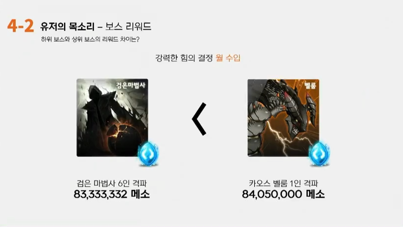 강원기: 우선 현재 보스리워드에 가장 큰 문제라고 하는 건 오랜 기간 라이브하면서 처음 보스 보상을 설정한 뒤에 점차 스펙 인플레이션이 발생하고 보스난이도가 낮아지게 됩니다. 이 과정에서 낮아진 난이도에 맞춰서 보스의 보상을 조정해야 되지만 이미 그 보스의 보상이 오랫동안 유지가 돼 있는 상태에서 그 보상을 조정하는 것은 쉽지가 않습니다. 이 부분을 한번 크게 조정했던게 결국은 보스 결정석을 추가하는 패치였고 기억하시는 분은 기억하시겠지만 그때는 엄청 욕을 많이 먹는 패치였습니다. 욕을 많이 먹는 패치였지만 당시에 생각할때는 결국은 보스의 난이도에, 컨텐츠의 난이도에 보상은 비례해야 된다는 생각에서 적용했습니다. 하지만 그 부분이 저희가 계속 유지를 잘 못했던 것 중에 가장 큰 부분이 저희가 보스결정석을 메소형태로 했고 메소형태로 했다라는 것은 저희는 가격을 되게 자주 바꾸려고 했었습니다. 거의 주단위로 변동까지도 고려했었는데 처음에 들어갔을 때 주단위 변동시스템이 못 들어갔고, 그러면 한달 후에 두달 후에 추이를 보면서 변경해야지 라고 했던것들을 계속 못했고, 그게 계속 유지됐던게 현재의 그림이 됐던 것 같습니다. 결국 저희가 좀더 의도를 살리고 보스의 리워드를 난이도에 맞춰서, 난이도라고 하는 것은 절대적인 난이도가 아니라 보스의 난이도와 캐릭터의 상대적인 스펙 난이도에 맞춰서 리워드를 계속 조정을 했어야 했는데 못했던 것이 지금까지 왔었구요.