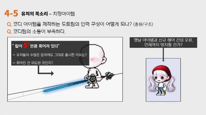 왕토: 시간관계상 빠르게 넘어가겠습니다. 코디팀의 소통이 부족하다라고 느끼는 부분들이 있어요. 마스터레벨 10기 칼이 5˚정도 휘어져있는데 이부분에 대해서 저희가 테스트서버때 굉장히 고쳐달라라고 요구를 많이 했었는데 결과적으로 그대로 나왔다라는 점 사례가 하나 있구요. 구기 마라벨인가요. 무한성단도 움직일 때 그림자 안없어지게 부자연스러운거 없애달라고 했는데 그냥 나왔거든요. 이런 소통이 조금 부족한 것 같다라는 느낌이 있어서 조금 소통을 늘려주셨으면 좋겠다라고 요구를 드리구요. 넘어가도록 하겠습니다.