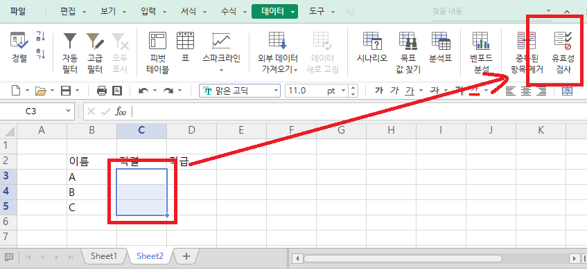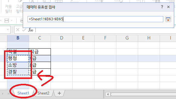특정 영역에서 드롭다운 목록을 끌어오는 방법도 있다. 일단 드롭다운 목록용 시트를 만들고 여기에 목록에 들어갈 데이터를 입력한다. 그 다음 본문 시트를 만든 뒤 마찬가지로 드롭다운목록을 적용할 셀을 선택하고 유효성검사를 클릭한다.