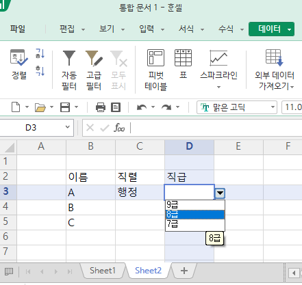 엑셀 문서를 보면 어떤 문서는 내용을 적는게 아니라 드롭다운형태로 선택하도록 하는 문서가 있다. 공무원이면 e호조 올리는 엑셀 서식에서 은행을 드롭다운으로 선택할 수 있고 상위기관에서 조사서식으로 내려오는 엑셀양식도 이상한 답을 적지 않도록 드롭다운으로 선택하도록 된 경우가 있다. 조금 더 고급기능으로 들어가면 대분류, 소분류 만들어서 선택하게 하는 기능도 있다지만 일단은 기본적인, 그냥 드롭다운 메뉴가 나오도록 하는 방법으로.