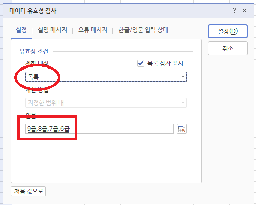 유효성 검사창에서 마찬가지로 제한대상을 '목록'으로 설정한 뒤 원본 옆 범위선택 버튼을 누르면 드롭다운에 들어갈 것들의 목록을 고를 수 있는데 여기서 아까 목록용으로 만들어 둔 것들을 선택한다.