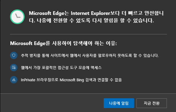 문제는, 이 지원중단을 앞두고 윈도우가 뜬금없이 '지금부터 전환할래?'를 물어본다는 것이다. 게다가 일부러인지 아래쪽의 Y/N 버튼 위치와 색깔 배치가 묘하게 안 맞아서 잘못 누르는 사람이 굉장히 많다. 이걸 전환하면 익스플로러 아이콘을 눌러도 전부 엣지가 켜지면서 사람을 돌아🤬버리게 한다. 단순히 웹서핑만 할 거라면 전환해도 상관없지만 다시 익스플로러를 쓰고 싶다면 다음과 같이 하자.