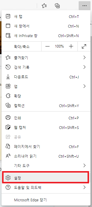 1. 마이크로소프트 엣지 오른쪽 위 메뉴를 누른 뒤 '설정'에 들어간다.