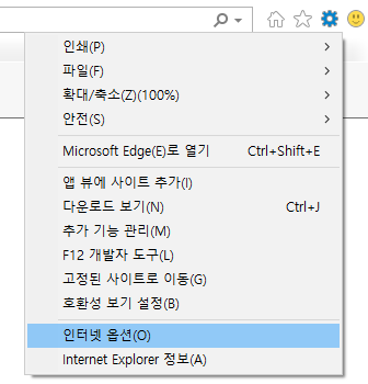 1. 익스플로러 오른쪽 위의 설정버튼 누른 뒤 '인터넷 옵션'을 클릭한다.