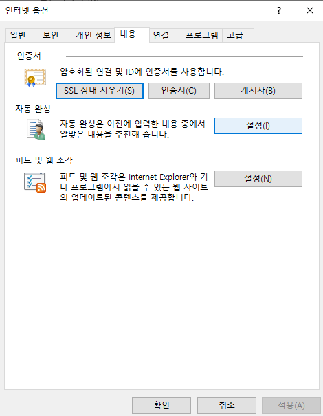 2. 인터넷옵션에서 '내용' 탭을 선택한 뒤 '자동완성'의 '설정' 버튼을 클릭한다.