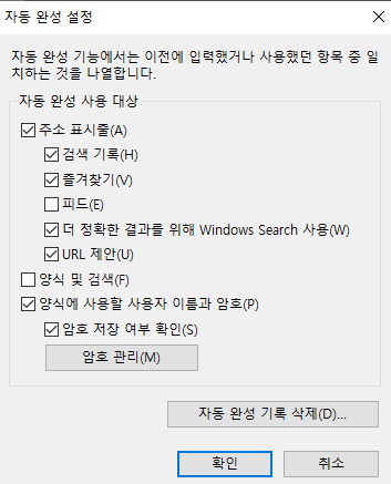 3. 자동완성 설정에서 필요없는 항목을 끄고 확인. 개인적으로는 '양식 및 검색'만 꺼도 상당히 쾌적해짐.