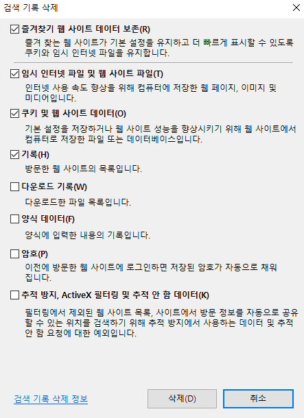 5. 삭제해야 할 기록을 선택. 이전 썼던 양식을 지우고 싶다면 '양식 데이터'만 클릭한 뒤 지우면 된다.