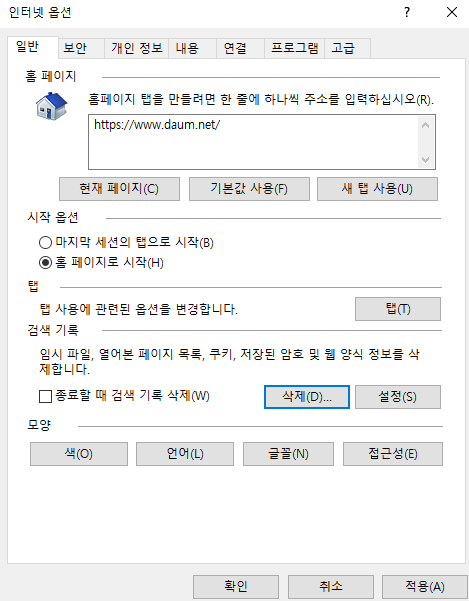 4. 여기까지만 하면 되는데, 찝찝한 사람들은 이미 저장된 내용을 삭제할 수도 있다. 인터넷 옵션 중 첫번째 '일반' 탭에서 '검색기록' '삭제'를 클릭