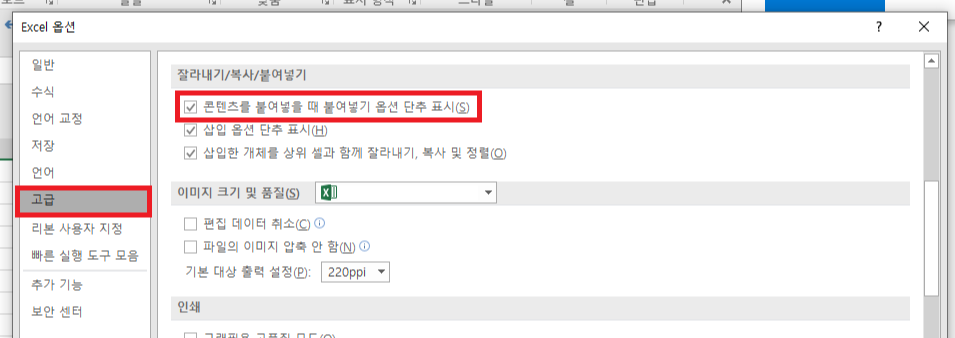 저 버튼 - 붙여넣기 옵션 버튼 - 은 없앨 수 있다. 엑셀 옵션에서 '고급'탭을 선택하면 '콘텐츠를 붙여넣을 때 붙여넣기 오션 단추 표시'라는게 있는데 체크버튼을 해제하면 붙여넣기를 해도 버튼이 뜨지 않는다. 그럼 붙여넣기 옵션이 필요할 때는? 단축키를 사용하자. CTRL+V는 일반 붙여넣기고 CTRL+ALT+V는 '선택하여 붙여넣기'로 붙여넣기가 된다.
