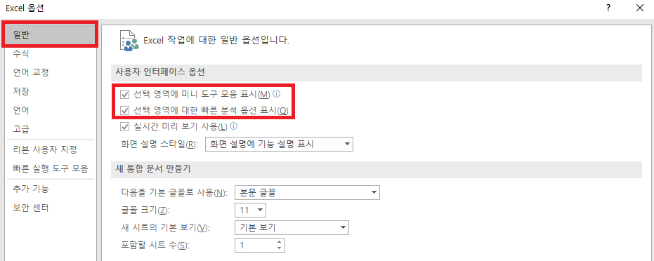 이 옵션도 끌 수 있다. 엑셀 옵션에서 '일반' 탭을 선택하면 '선택 영역에 미니 도구 모음 표시'와 '선택 영역에 대한 빠른 분석 옵션 표시'가 있는데 이를 체크 해제하면 이후 해당 버튼이 뜨지 않는다.