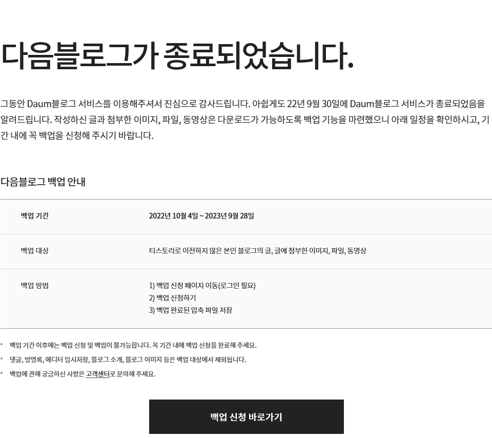 - 2022년 9월 30일 이후로는 티스로리로의 이전이 불가능하며 기존 블로그의 내용을 확인하기 위해서는 백업을 통해 글, 이미지, 동영상 등을 확인할 수밖에 없다. 백업신청은 2023년 9월 28일까지이며 다음블로그 페이지(클릭)을 통해 백업신청이 가능하다. 티스토리로 이전이 완료된 다음블로그에 대해서는 서비스 종료 후 백업데이터를 전송해주지 않는다.(공식블로그 답글 내용) 이미 티스토리로 이전되어서 백업데이터를 받을 필요성이 떨어진다고 보는 듯.