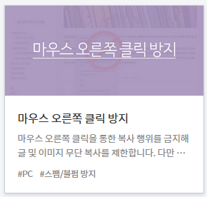 - 티스토리에서 블로그 오른쪽 클릭을 막으려면 별도의 플러그인(확장기능)을 적용해야 한다. 블로그 관리자로 접속한 뒤 왼쪽 메뉴에서 플러그인 메뉴를 선택한 후 '마우스 오른쪽 클릭 방지'를 눌러 적용버튼을 누르면 된다.