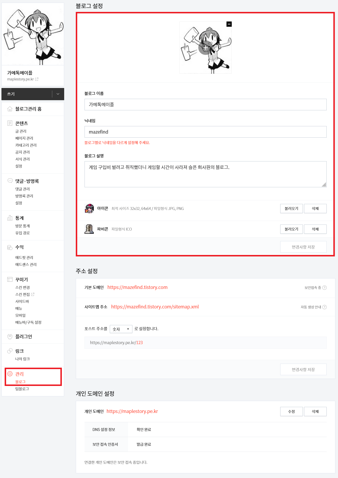 - 티스토리의 프로필 설정은 '블로그 설정'에서 가능하다. 관리자페이지 가장 아래쪽의 '블로그' 관리버튼을 눌러서 바꿀 수 있다. '아이콘'은 다른 티스토리 블로그에서 댓글을 쓸 때 달리는 그림이며 '파비콘'은 자신의 블로그에 접속할 때 브라우저에 보이는 그림이다.