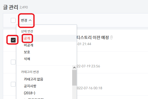 - 앞서 말했듯 티스토리는 친구 기능이 없으므로 친구 목록은 이전되지 않으며(*) 블로그 자체를 친구공개하는 기능도 없으므로 티스토리로 이전하면 블로그 자체는 공개가 된다. 다만, 글이나 카테고리를 친구공개로 해두었거나 블로그를 친구공개로 설정한 경우 티스토리로 이전하면 해당 글이 '비공개'상태로 이전된다(이전 안되는게 아님). 따라서 이런 상황의 블로그는 티스토리를 들어가도 글이 하나도 보이지 않는 상태가 되며 티스토리 로그인을 해야 비공개글을 확인할 수 있다. 이를 공개로 하고 싶다면 티스토리의 글목록에서 해당 글을 공개로 변경해주어야 한다. 이 방법으로도 글이 공개되지 않는다면 블로그 카테고리가 비공개처리되어있을 가능성이 있으므로 확인해 볼 것. 이러한 티스토리 공개 전환 작업을 하고 싶지 않다면 블로그 이전 신청 전에 다음블로그를 전체공개로 바꾸고 이전신청해야 한다.