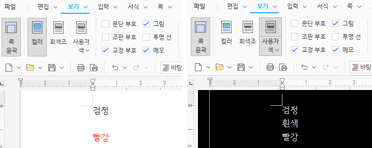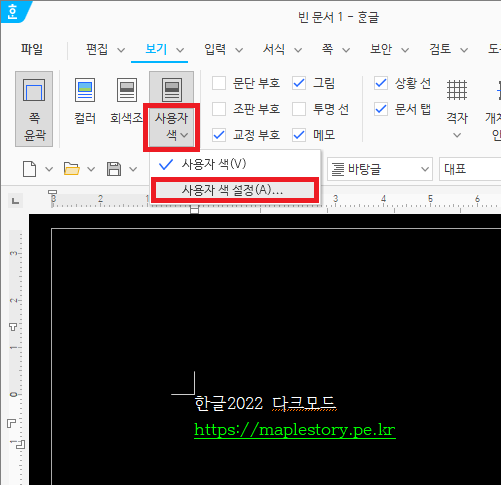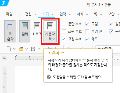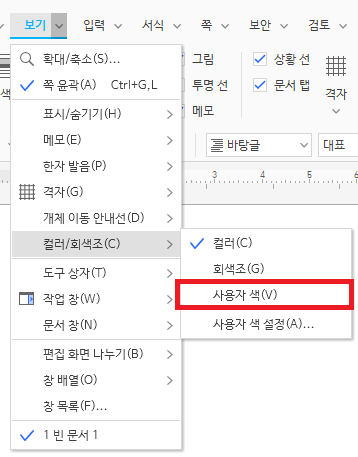 한글 2022버전을 열어 '보기'메뉴를 누르면 위 사진처럼 '사용자 색'이라는 버튼이 하나 추가된 것을 확인할 수 있다.