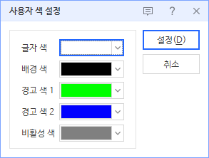 그러면 위와 같이 편집창이 검게 변하고 글씨색이 흰색으로 변한 것을 확인할 수 있다. 그리고 사용자 색 설정을 누르면 배경색 및 글자색을 설정할 수 있다. 각 항목은 다음과 같다.