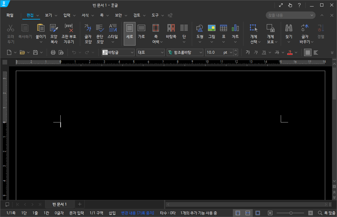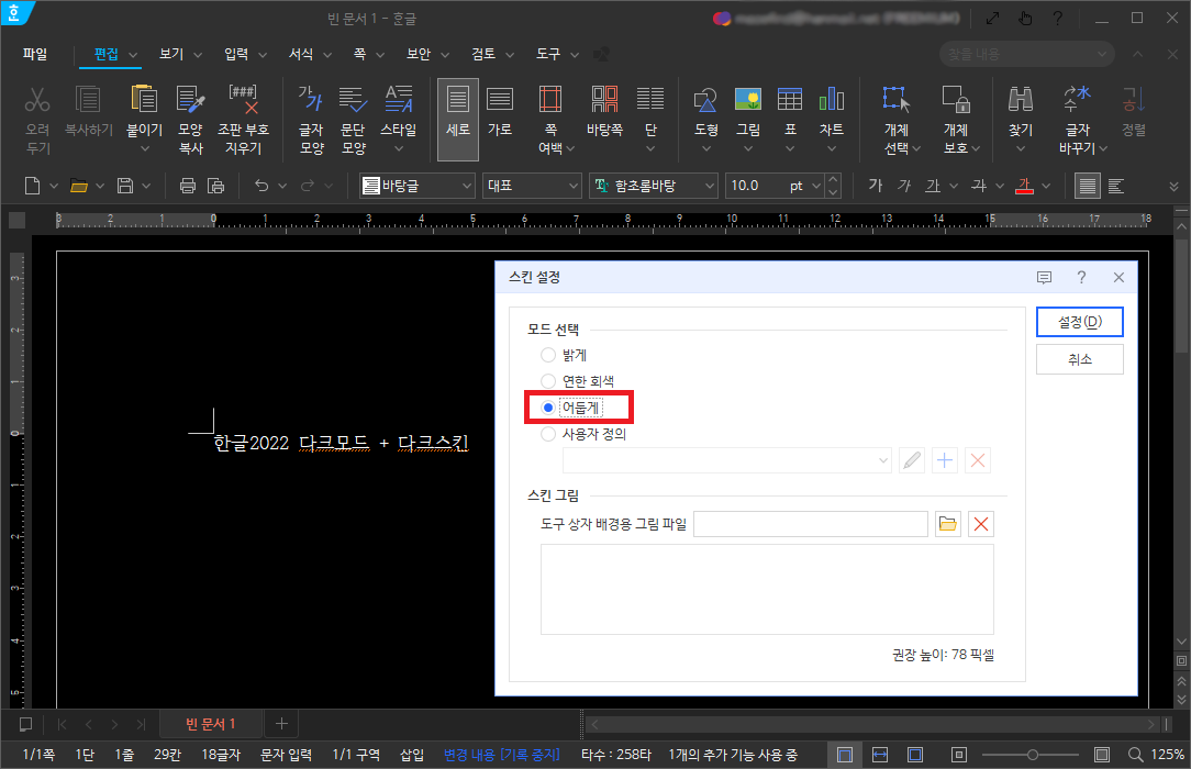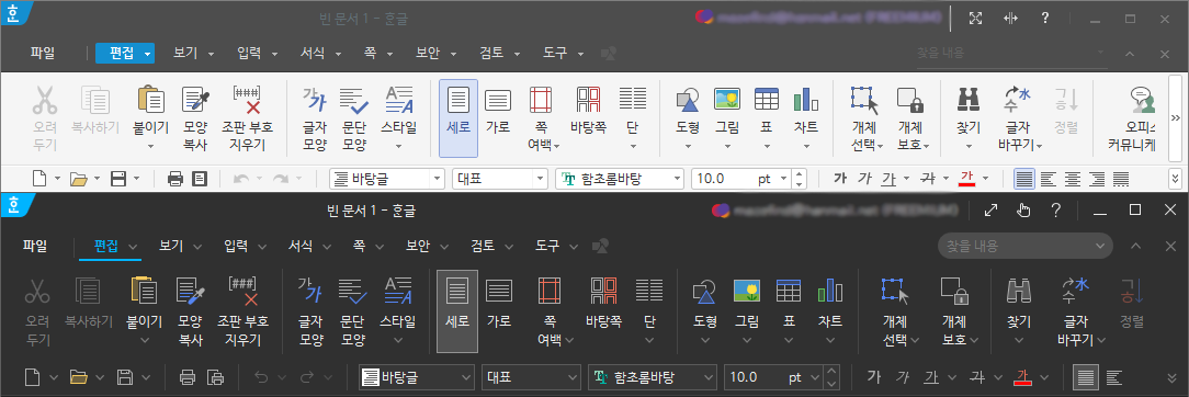 아무튼, 이 중에서도 특이한 기능이 하나 있는데 고대비모드(다크모드)와 어두운스킨 지원이다. 이를 둘 다 적용하면 위 사진처럼 편집창 전체를 어두운 톤으로 한 채 작업하는 것이 가능하다. 어두운스킨은 2020버전에서도 지원했으나 (아래에 적겠지만) 약간 불완전한 모양새였고 고대비모드는 2022버전부터 지원하므로 이전 한글에서는 사용할 수 없음에 유의하자.