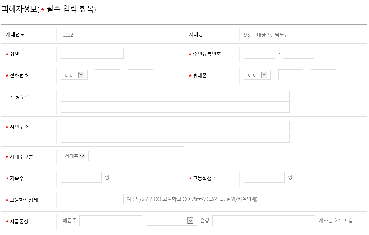 - 피해자 정보: 피해지의 주소, 사업장 정보, 피해자 성명, 재난지원금 수령 계좌번호, 이동전화 정보를 기록한다. 주거형태는 필수작성이 아닌 경우가 많은데 전월세 주택의 경우 주택 소유자와 세입자가 동시에 신고를 하는 경우가 있으니 이 경우는 기록해두는 것이 좋다(*). 고등학생 수는 있는 경우만 기록한다.