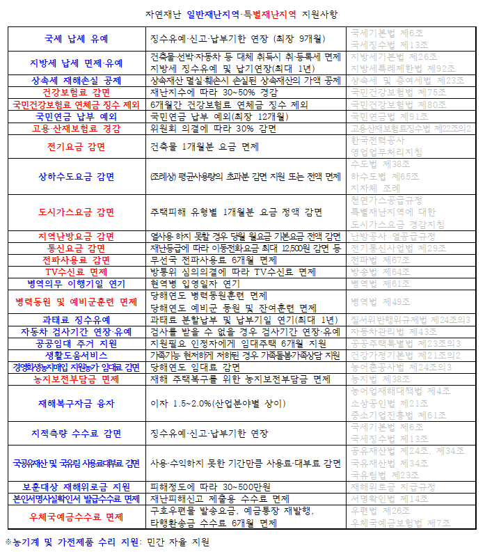 또한 재난이 심각한 경우 해당 지역을 특별재난지역으로 선포하는데 해당 지역에서 피해를 입은 경우엔 「재난 및 안전관리 기본법」에 따라 추가적인 감면 및 혜택이 있다. 이 혜택을 받기 위해서는 재난피해신고를 해서 피해를 인정받아야 한다. 현재 재난피해는 신고를 해야 조사 후 인정받을 수 있다.