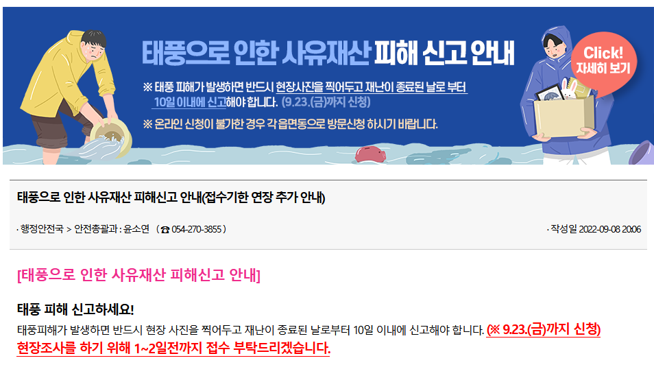 그리고 가장 중요한 점, 재난피해신고는 관련법령에 따라 재난종료일부터 10일 이내에 신고해야 한다. 기간을 연장하는 규정이 있기는 한데 그게 상위기관과의 협의가 필요한 등 절차가 복잡하여 기간이 항상 연장되지는 않기 때문에 복구작업과 동시에 신고를 해야 한다고 숙지하는 것이 좋다. 2022년 힌남노 태풍의 경우 신고기간이 원칙대로 9월 16일까지 였으나 신고기간이 연장되어 2022년 9월 23일까지 신고하면 된다.