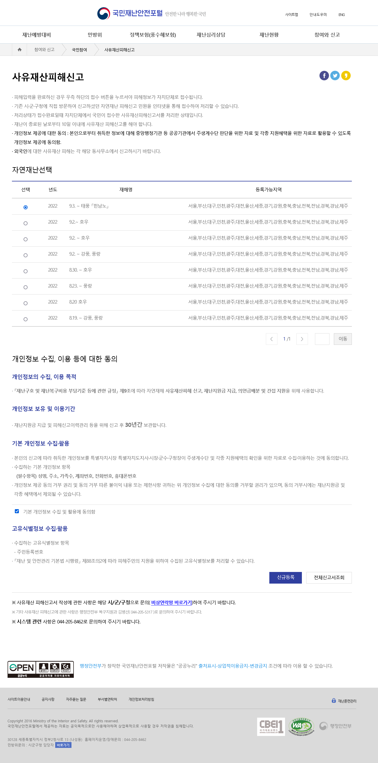 산불이나 태풍, 집중호우, 그리고 (발생하지 않을 줄 알았던) 지진 등 각종 자연재해가 닥치면 발생 지역에는 막대한 피해가 발생하게 된다. 특히 주택이 무너지거나 침수되는 등 피해가 발생할 경우, 가까운 행정복지센터에 자연재난으로 사유재산에 피해를 입었다는 재난피해신고를 하고 이것이 피해를 입었다고 인정될 경우 (부족하지만) 피해에 대한 재난지원금을 받을 수 있다(*). 이 글을 쓰는 계기는 2022년 9월 태풍 힌남노가 포항을 초토화시켰기 때문이지만 이전 2017 포항 지진으로 인해 당시 포항시 북구에 살던 시민의 상당수는 이 신고서를 작성해본 경험이 있으리라 생각한다. 참고로 당시 포항지진 본진과 여진 전체 신고건수는 약 7만건이었다(**).