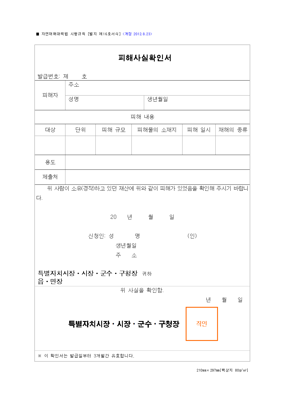 이후 작성자 이름을 쓴 뒤 서명을 하고 3쪽의 각종 동의사항에 동의함을 체크한 뒤 제출. 피해사진 등은 제출해야 하는 메일주소가 읍면동마다 다르므로(각 읍면동의 재난담당자가 다르기 때문) 미리 사진을 준비해서 작성 직후 바로 보내도록 하자. 간혹 자동차세 감면 등 재난지역의 각종 지원 신청을 할 때 피해사실확인서(확인원)를 요구하는 경우가 있는데, 해당 서류는 재난피해신고 후 피해를 인정받고 난 뒤 읍면동 행정복지센터를 방문하여 발급가능하다.