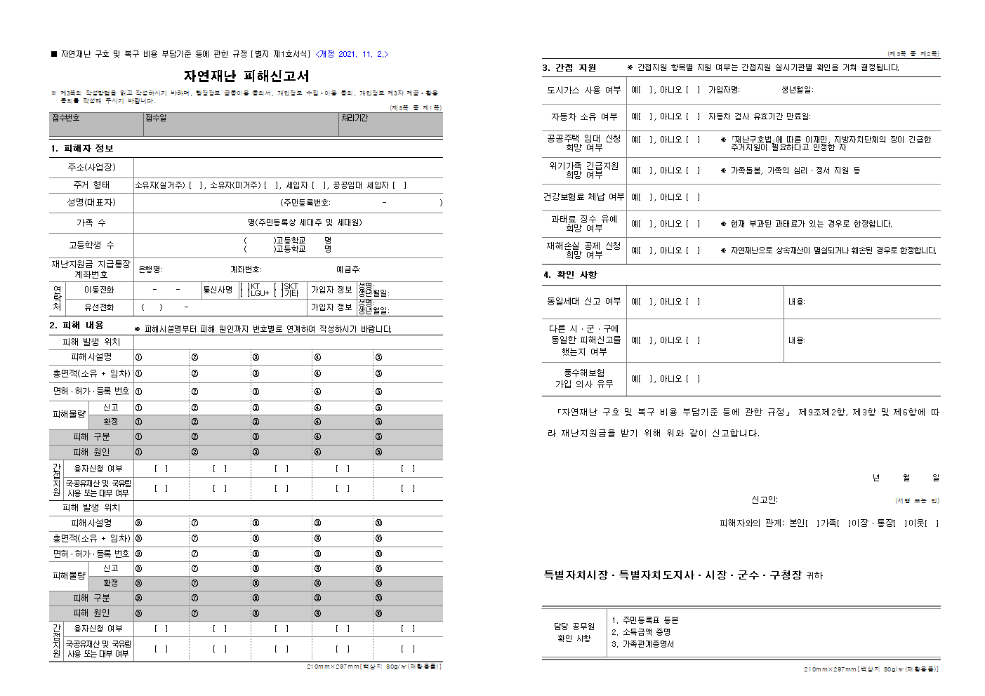 오프라인 신고는 재난지역의 주민등록등본상 주소지 읍면동 행정복지센터(읍면동사무소)에서 접수를 받는다. 만약 전입신고를 하지 않았다면 해당 지역 행정복지센터에 문의할 것. 재난이나 지자체에 따라 그때그때 세부작성사항이 달라지니 미리 가서 확인하는 것이 좋다. 당연하지만 신분증은 필수. 2021 재난피해신고서는 총 3장으로 구성되어 있고 다음과 같이 작성한다.