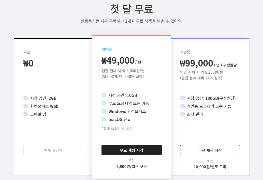 그래서 가장 중요한 것은 가격인데, 2022년 9월 오픈 기준 개인용 구독료는 월 6,900원, 년 49,000원이다. 무료사용자는 2GB의 웹하드공간과 웹형 한컴오피스를 무료로 이용할 수 있으나 데스크톱 한컴오피스를 다운받기 위해서는 유료구독이 필요하다. 한컴스페이스 시절과 비교하면 연단위 구독가격이 소폭 하락하였다.