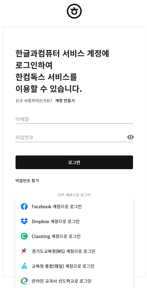 한컴독스에 접속 후 회원가입과 로그인을 진행한다. 이전에 한컴스페이스(말랑말랑플랫폼) 계정이 있다면 해당 계정으로 바로 로그인할 수 있다. 사진에는 없지만 기본적으로 구글 / 애플 / 네이버 / 카카오 로그인을 지원하고 페이스북, 드롭박스, 클래스팅 계정으로 로그인을 하는 것도 가능하다.