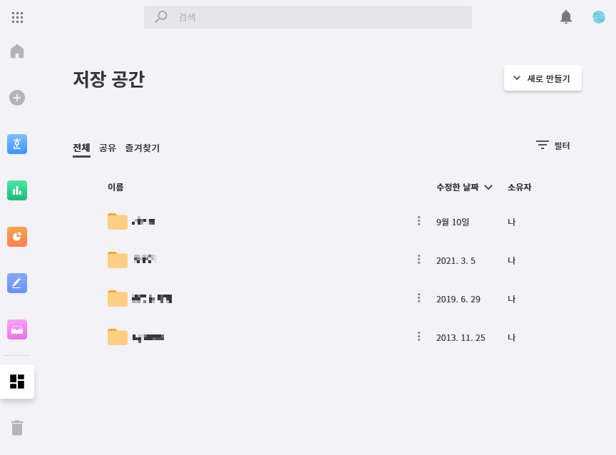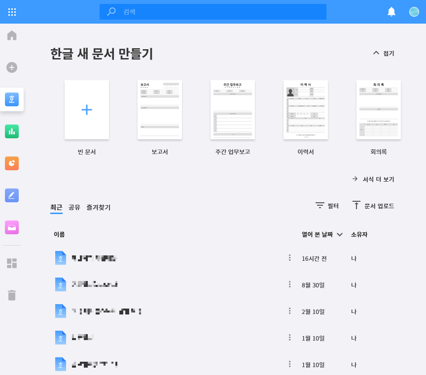 로그인하면 최근 문서와 저장공간, 각 문서별 메뉴가 있다. + 메뉴를 누르면 문서를 만들 수 있다. 한컴스페이스때와 마찬가지로 웹용 아래아한글을 실행하면 hwpx 확장자로 기본생성된다. 이 외에도 웹용, 한셀/한쇼/한워드/한폼 문서를 생성할 수 있다. 웹용 한셀과 한쇼는 기본 확장자가 xlsx, pptx 이며 한워드는 docx 확장자가 기본이다. 이 경우 패키지형 한컴오피스를 열고 한컴독스를 연결한뒤 불러오기를 통해 문서를 열어야 한다.