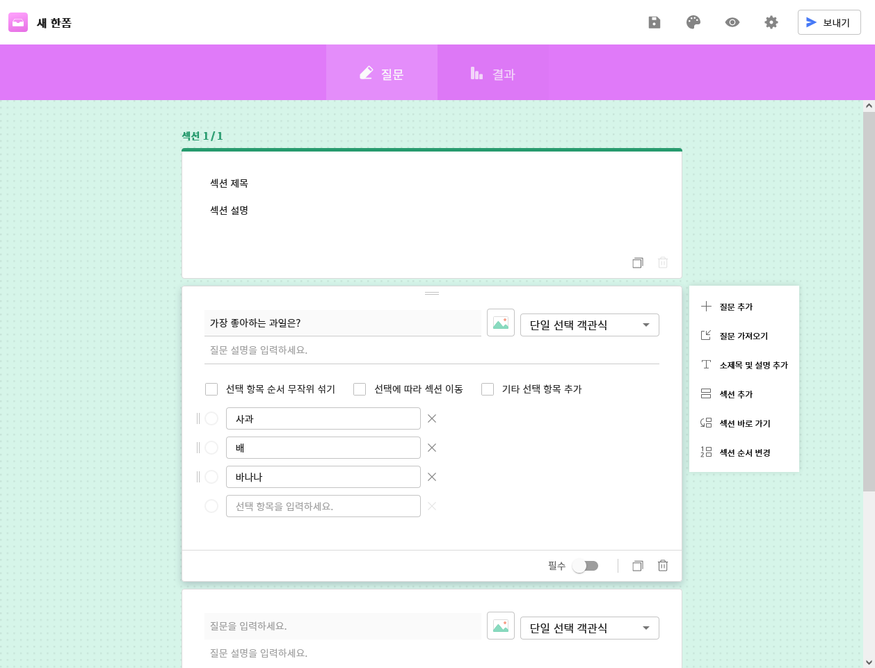 이번 한컴독스에서 추가된 '한폼'은 설문조사 문서를 만들 때 사용하며, 구글독스의 폼즈와 네이버 폼과 유사하다. 지금 오픈 초기라서 저장 후 일정 시간동안 권한이 없다면서 수정이 되지 않는 등의 문제점이 있으니 어느 정도 안정화 이후 사용하는 것이 좋을 듯하다.
