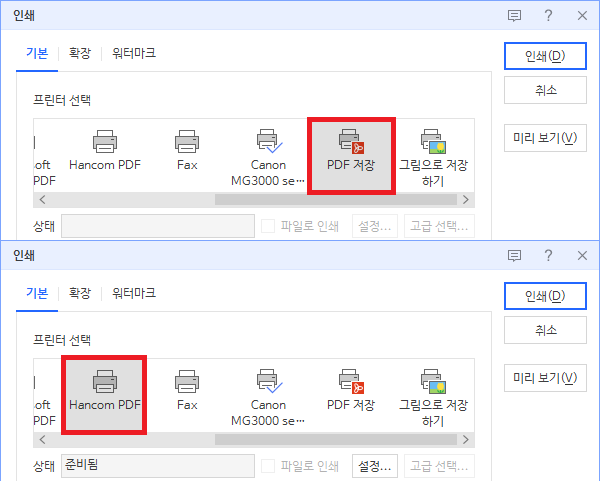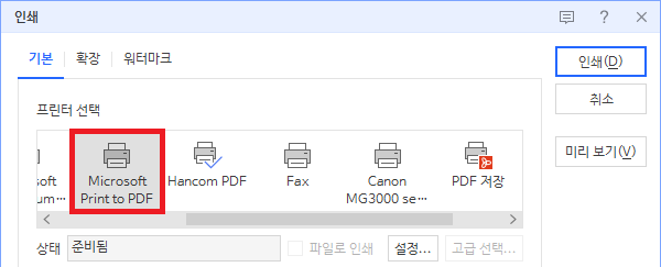 이 방법이 아니라면 '인쇄' 메뉴에서도 PDF로 변환(정확하게는 'PDF로 인쇄')하는 것이 가능하다. 인쇄메뉴에서 프린터를 'PDF 저장' 또는 'Hancom PDF'로 고른 뒤 인쇄하면 PDF 저장 화면이 뜬다.