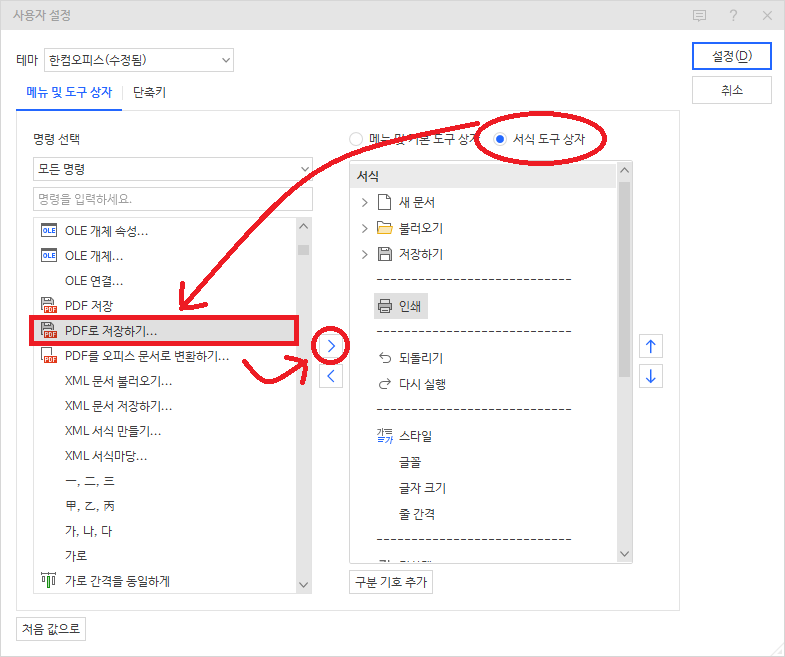 그러면 이와 같이 도구상자 편집이 뜨는데 여기서 '서식도구상자'를 클릭한 뒤 명령 선택에서 'PDF로 저장하기'를 클릭하고 '>' 표시를 눌러 도구상자로 옮기자. 위치가 마음에 들지 않는다면 '↑', '↓' 버튼을 눌러 조정한 뒤 '설정'을 눌러 저장하자.