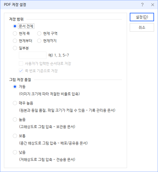 그러면 이와 같이 저장 창이 뜨는데 폴더를 지정하고 저장하면 끝난다. 참고로 아래쪽 '도구'를 누르면 PDF 변환시 변환 범위와 그림 압축 품질을 설정할 수 있다. 경험상 문서에 첨부되는 사진을 인쇄용으로 보고 싶다면 '자동' 변환으로도 큰 차이 없이 변환이 가능했다.