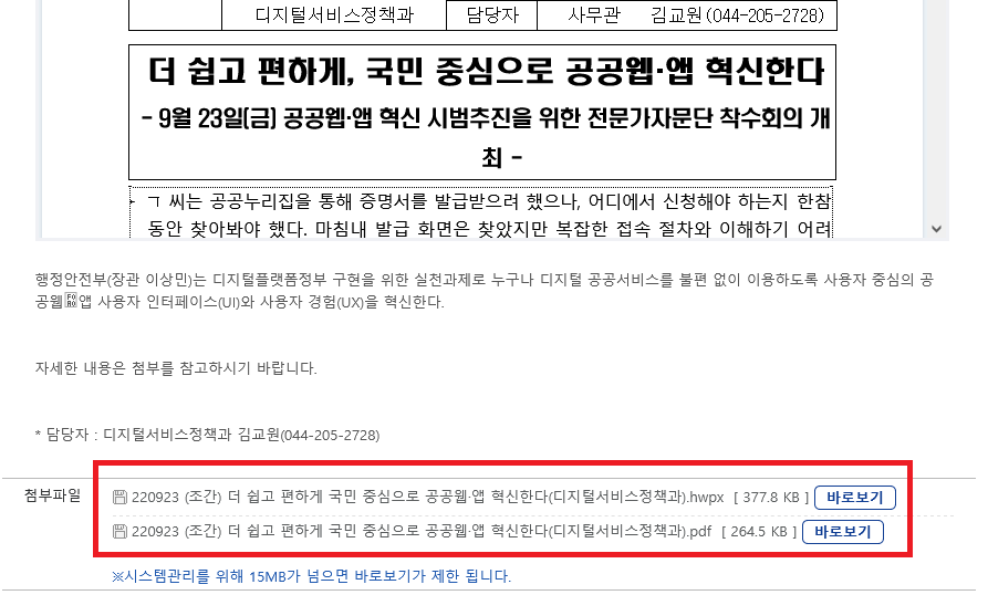 hwp 포맷에 대한 이야기가 나오면 항상 나오는 이야기가 공공기관의 PDF 활용이다. 수정하는 것까지 생각한다면 MS워드(.docx)나 오픈포맷(.odt) 파일을 같이 올려야 하겠지만, 많은 사람들은 여기까진 바라지도 않고 한컴 뷰어 없이 다양한 프로그램에서 열 수 있는 PDF 파일이라도 올려달라고 생각한다. 이런 의견에 따라 일부 기관에서는 보도자료 등을 올릴 때 hwp 파일과 pdf을 동시에 올리기도 한다. 예를 들면 행안부나 법제처 등의 중앙부서.