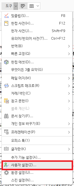 상단 메뉴에서 [도구 > 사용자설정]을 클릭하자.