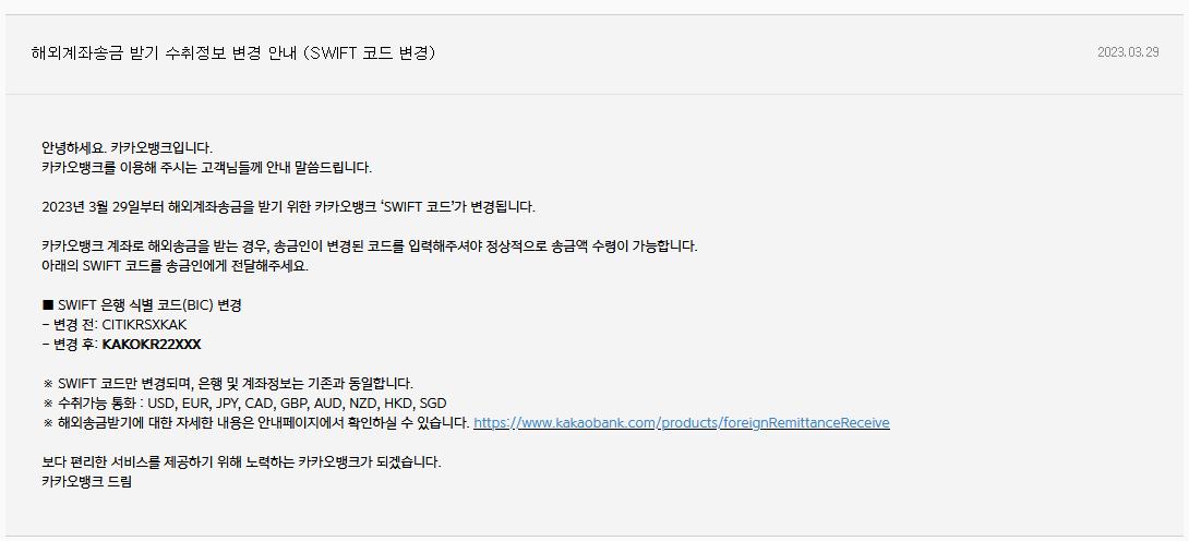 그런데 2023년 3월 29일부터 카카오뱅크가 해외 계좌송금을 위한 코드정보를 아래와 같이 변경했다.