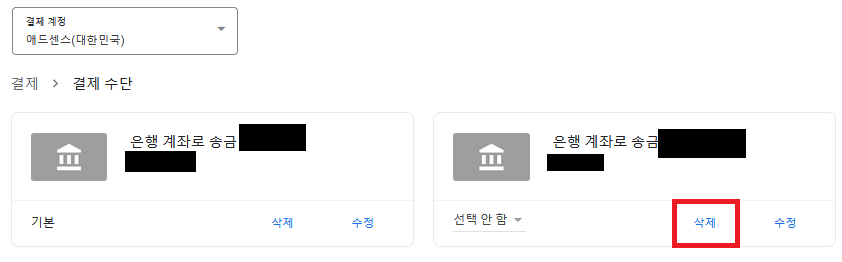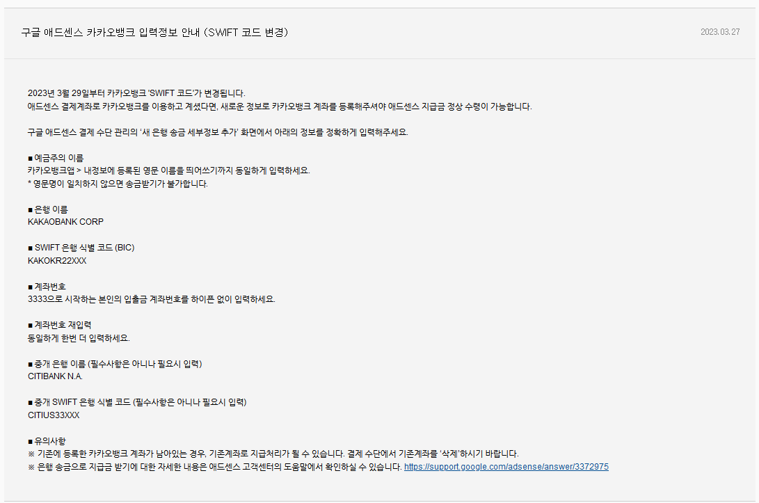 이 내용은 애드센스 광고수익 입금에도 영향을 미치므로 변경하지 않으면 수익금이 들어오지 않을 수 있다. 기존 코드로 결제수단을 등록한 경우 다음과 같이 변경해야 한다.