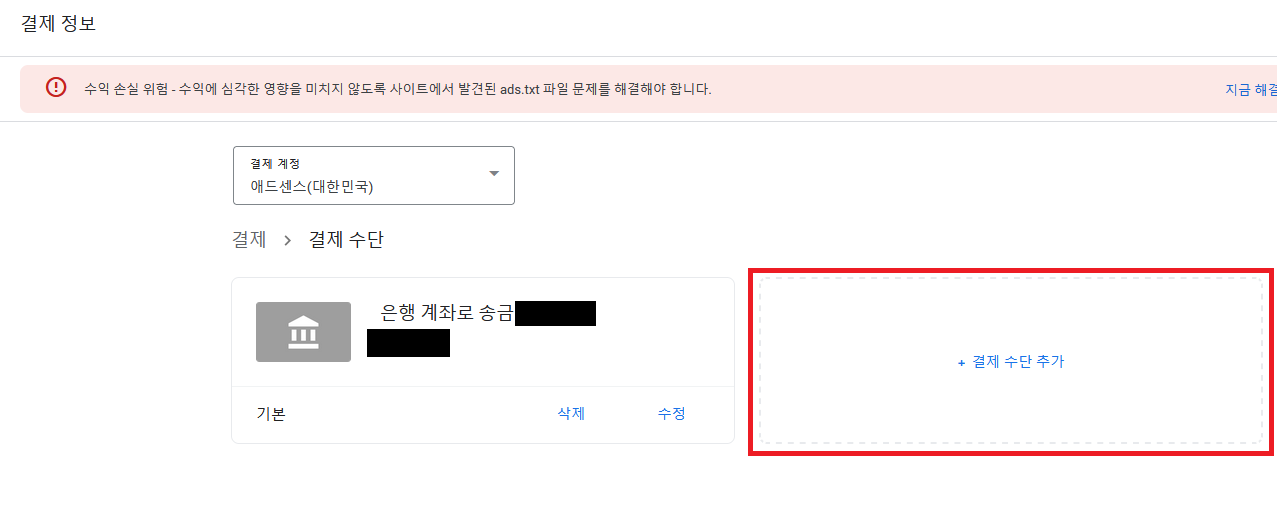 1. 구글 애드센스에 에 로그인한 뒤 [지급 > 결제정보] 메뉴로 들어간다. 글쓴이처럼 이미 카카오뱅크로 결제수단을 입력한 경우 '수정'을 해도 스위프트코드를 수정할 수 없으므로, 결제수단을 하나 더 추가하고 기본결제수단을 바꾸는 방법을 사용한다. '결제수단 추가'를 클릭하자.