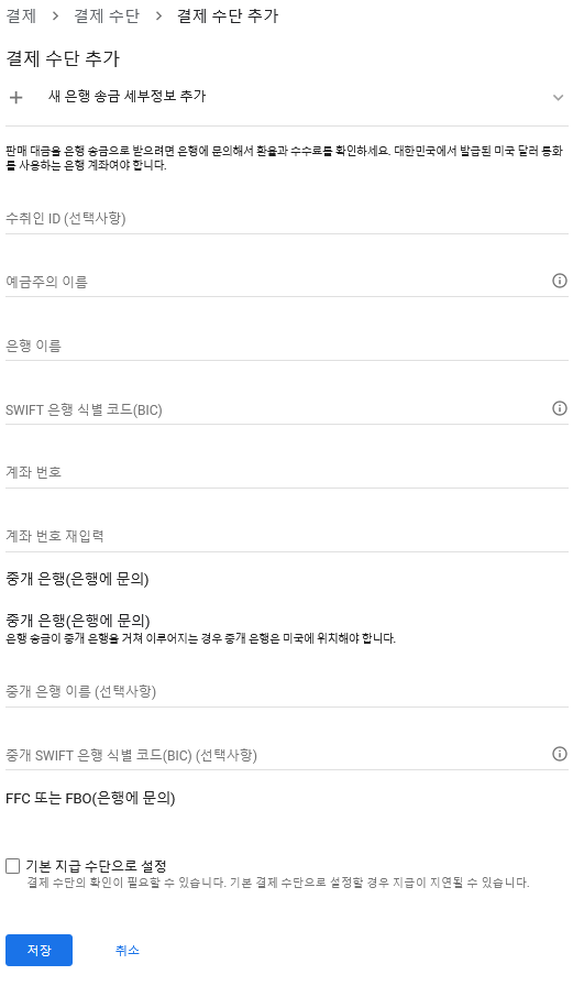 2. 결제수단 추가 화면에서 '새 은행 송금 세부정보 추가'를 클릭한다.