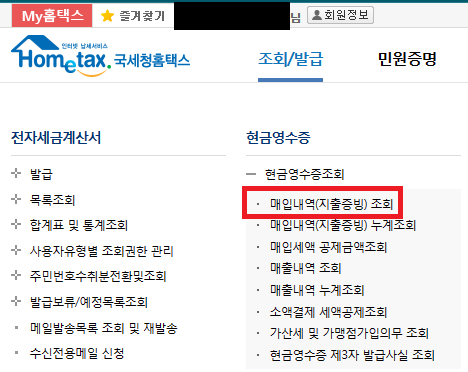 로그인하면 '조회발급' 메뉴 밑에 '현금영수증조회>매입내역(지출증빙) 조회' 메뉴가 있다. 이 곳으로 접속하자.